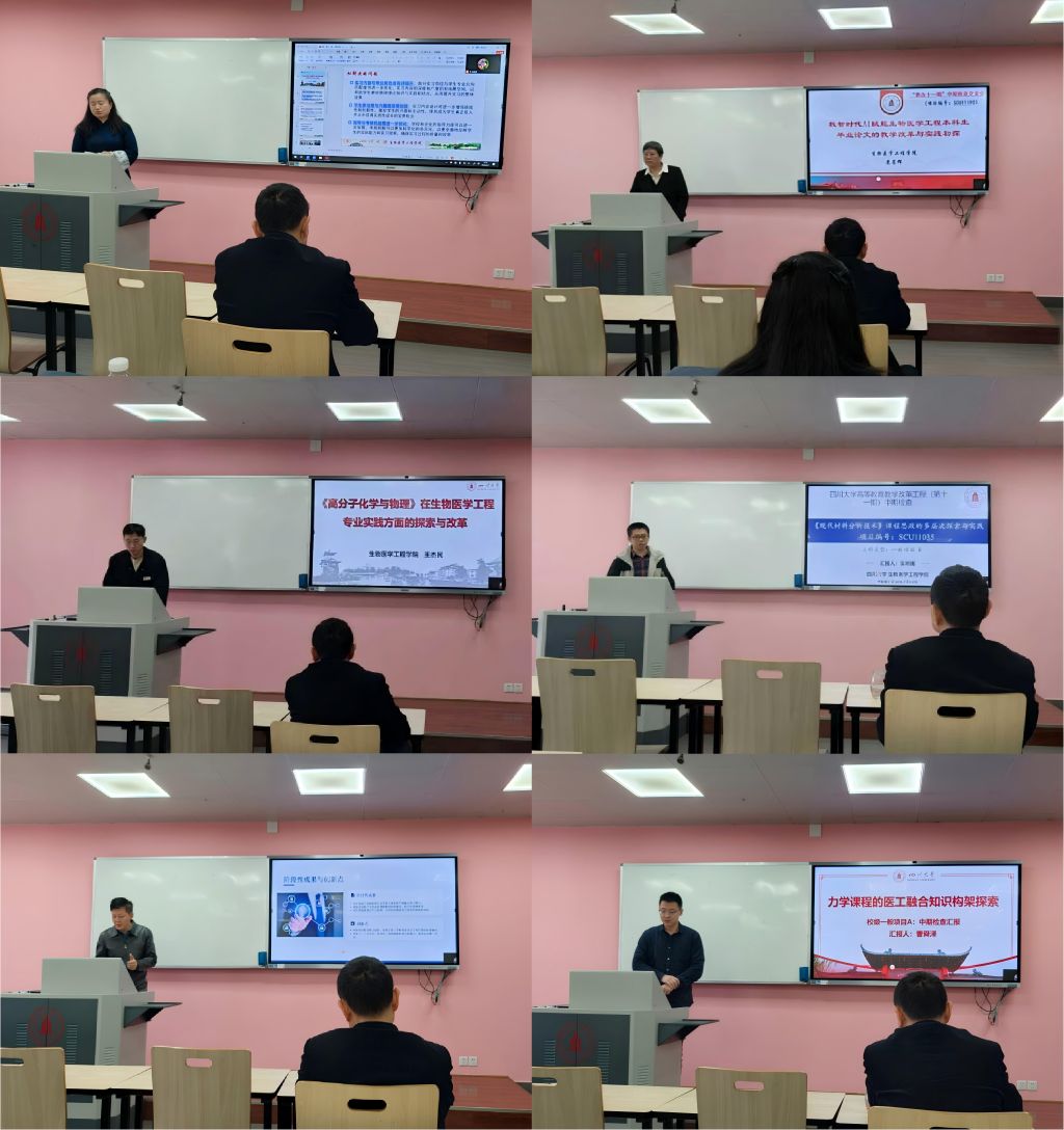 会上,蒲曦鸣、苏葆辉、吴明雨、周长春、王杰民、曹舜泽、曹俊等7位项目负责人依次围绕各自立项项目,从研究进展、阶段性成果、存在问题及后续计划等方面进行了详细汇报。汇报主题有“产教融合背景下生物医学工程专业双向适配机制精准化实习范式的构建”、“数智时代AI赋能生物医学工程本科生毕业论文的教学改革与实践初探”、“力学课程的医工融合知识架构探索”等多个内容,展现了学院在教学改革领域的探索与目前的实践成果。